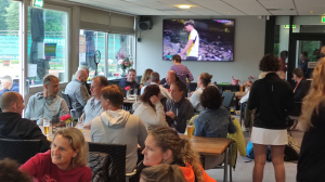 Langzaam maar zeker namen de teamleden die al klaar waren plaats aan tafel en sommigen werden daarbij vergezeld door partners en kinderen. Op een gegeven moment leek het wel een gezellig familiefeest. Iedereen druk pratend en lachend en spelende kinderen; echt gezellig. Sfeerverhogend was ook zeker de tenniswedstrijd op het grote scherm van Roland Garros tussen Griekspoor en Zverev, waarbij helaas de laatste de partij in een zinderende vijfsetter naar zich toetrok.